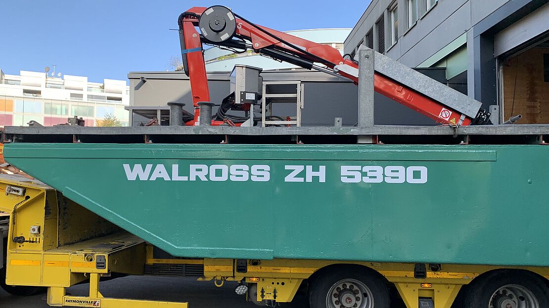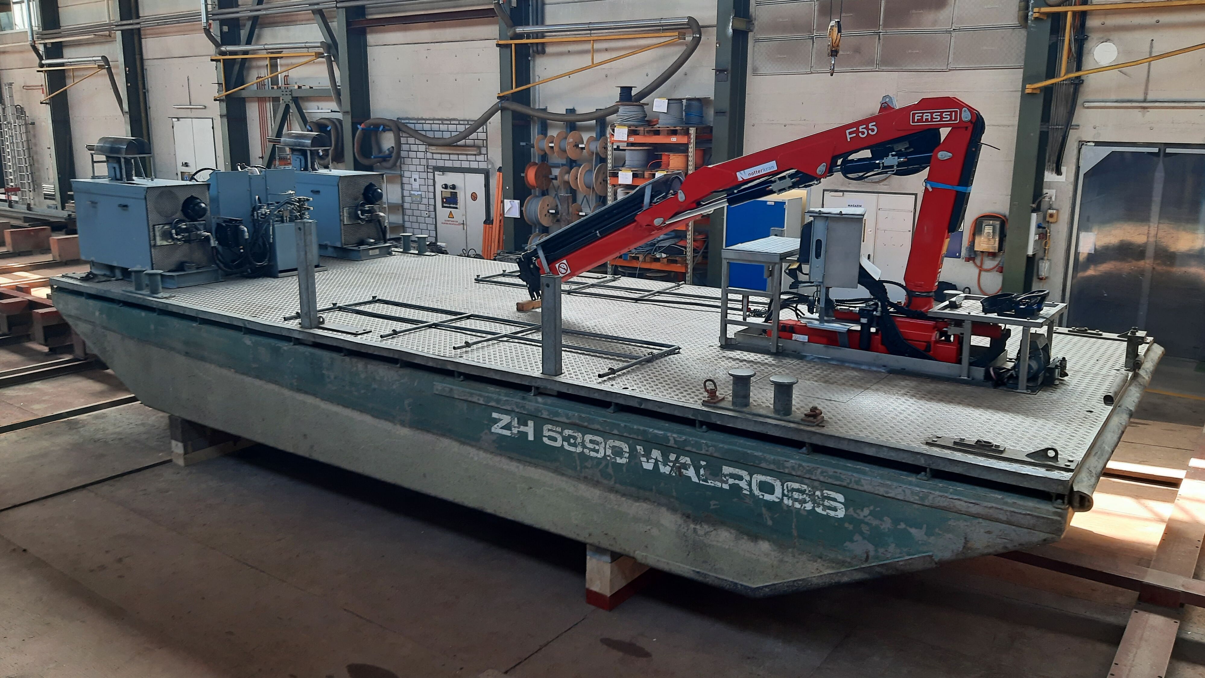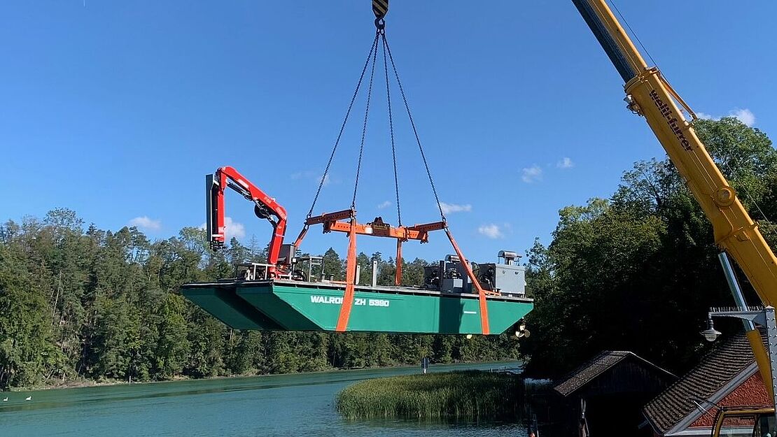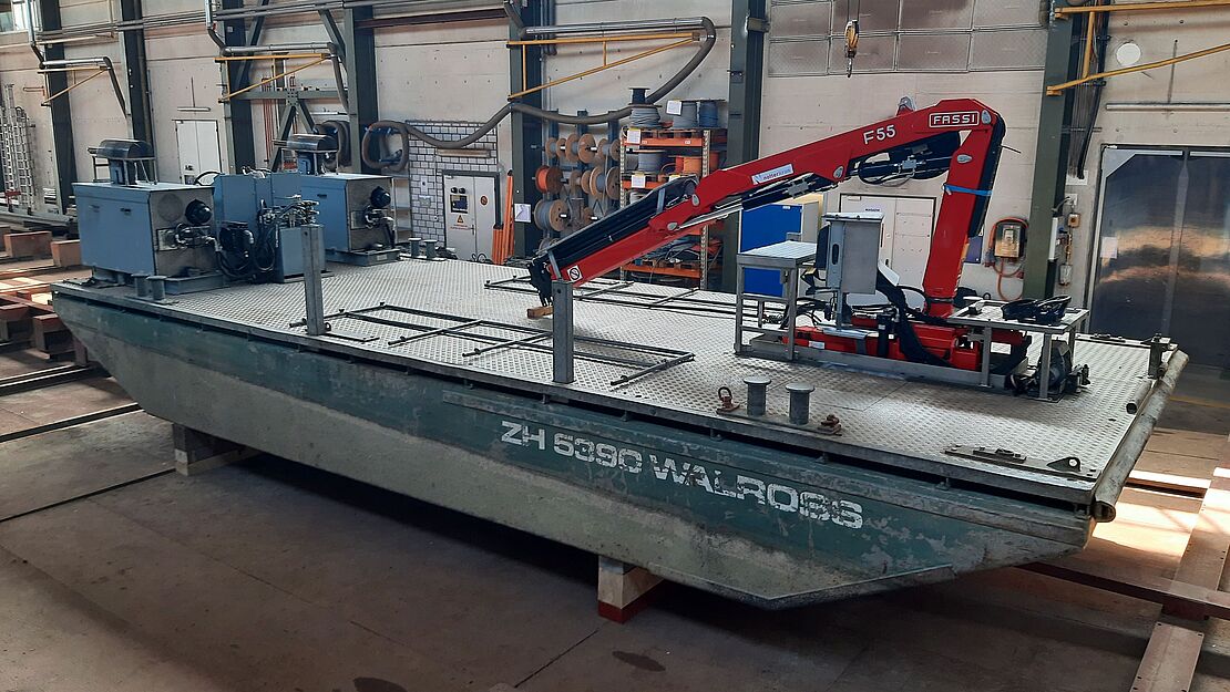 Le bateau de travail "MS Walross" de la centrale électrique d'Eglisau-Glattfelden AG a passé près de trois mois chez Shiptec pour effectuer des travaux de révision. La plate-forme de travail avec grue sert à l'abattage du bois sur les berges autour de la centrale.