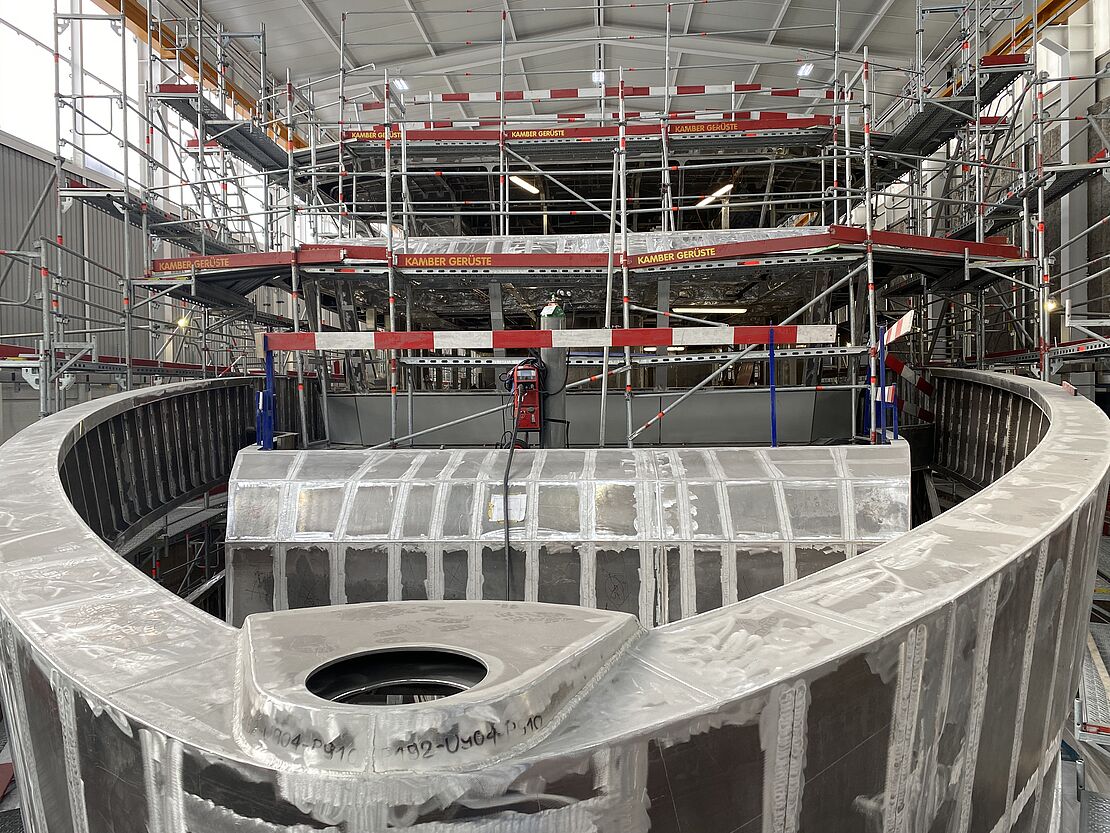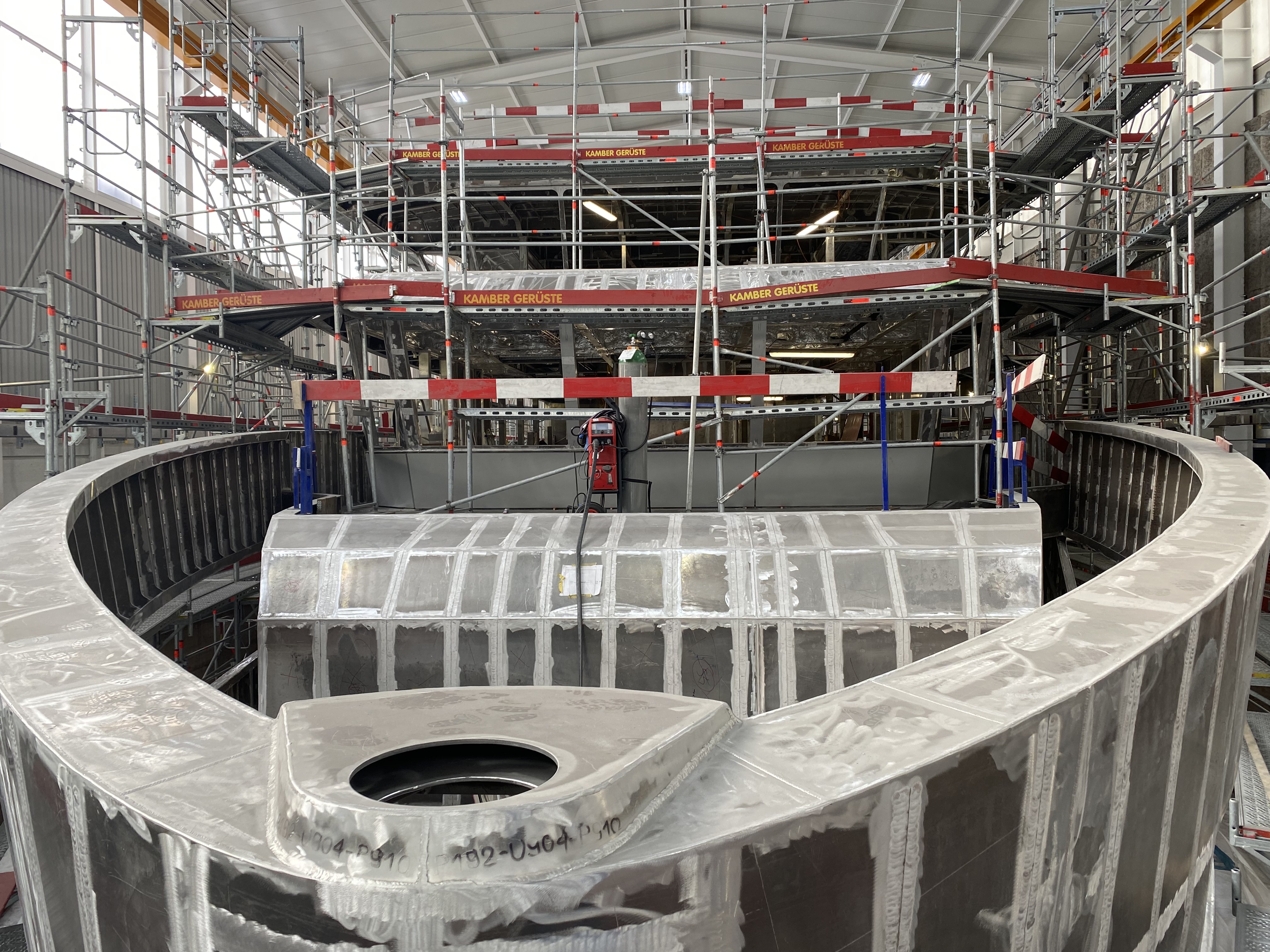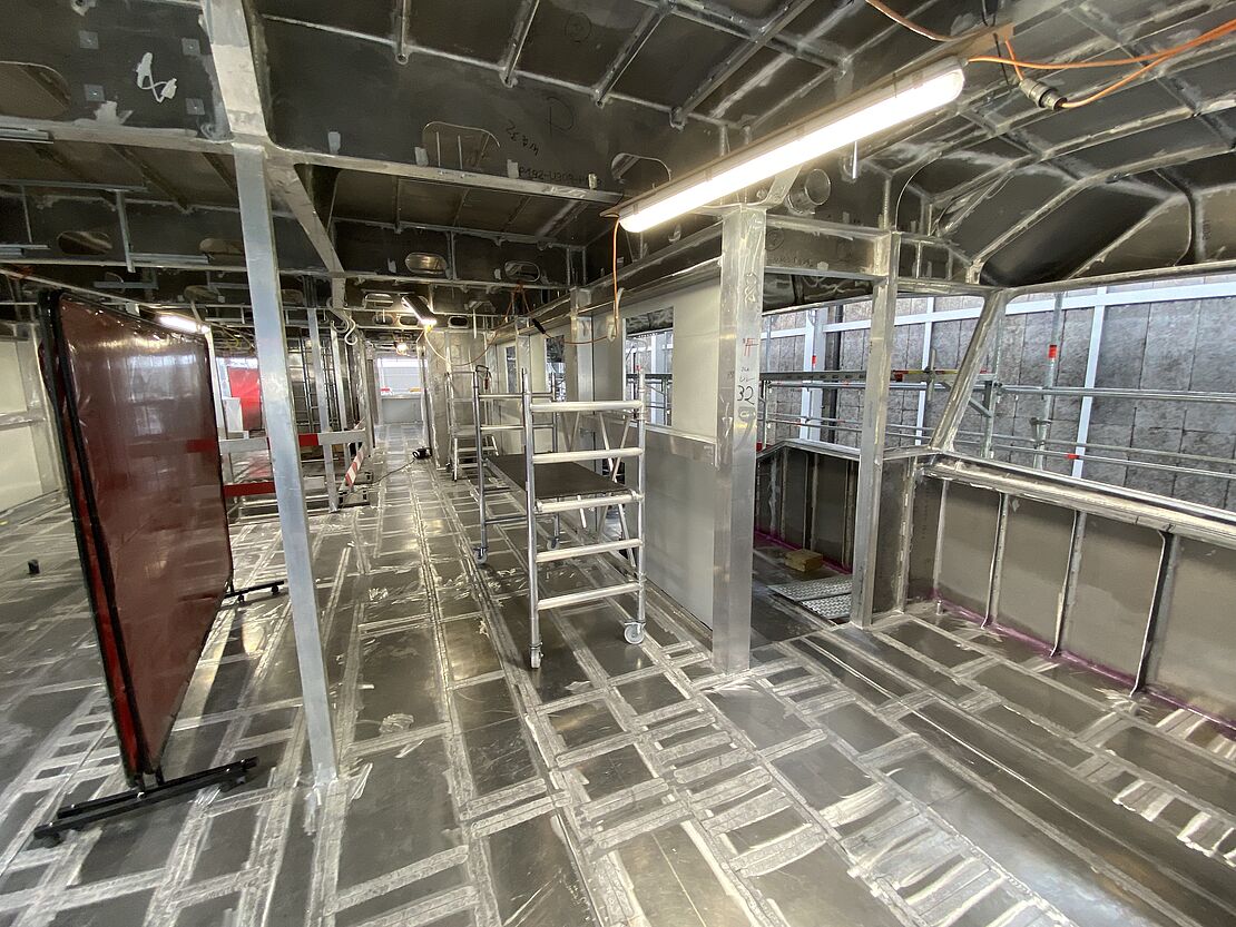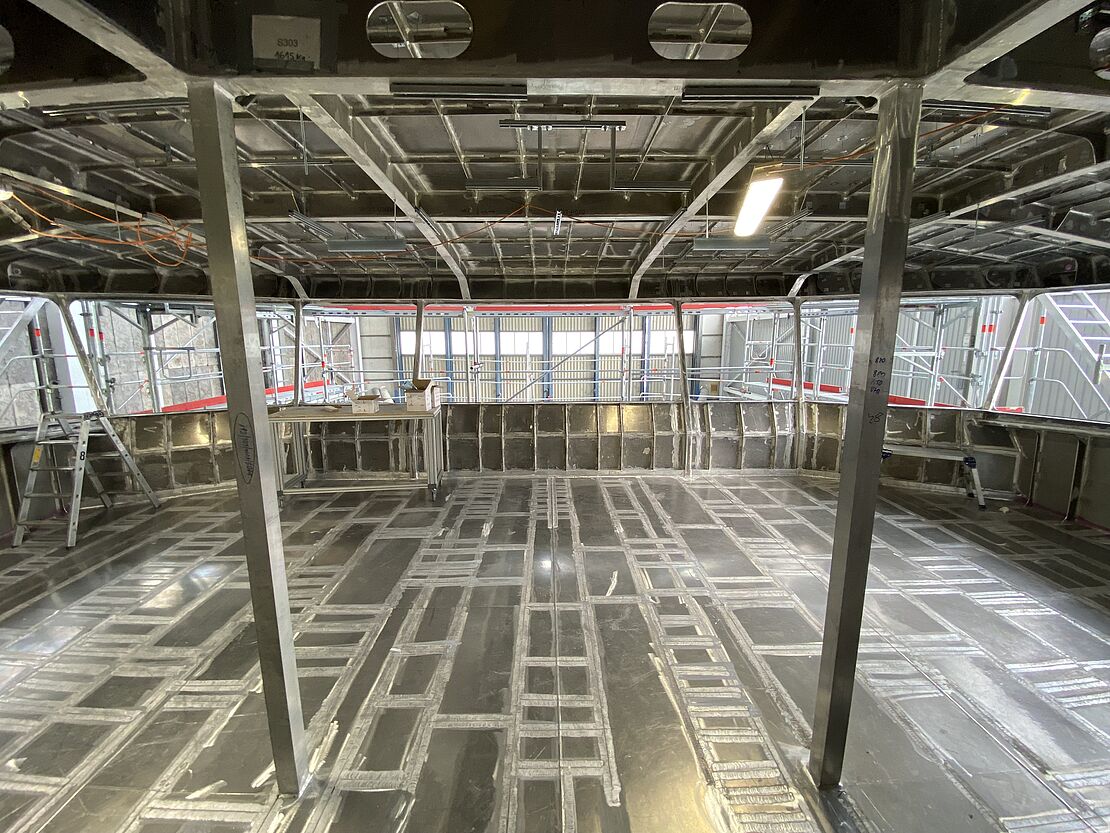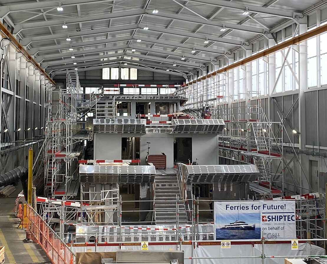 Le gros œuvre du dernier navire de la CGN a été achevé. La prochaine étape consistera à appliquer la peinture sur le revêtement extérieur afin de pouvoir déplacer le navire du chantier naval à l'eau. L'intégration des systèmes et l'aménagement intérieur débuteront ensuite, tandis que les premières sections du deuxième ferry seront déjà livrées et assemblées dans le hall du chantier naval.